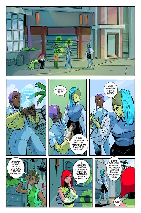 “As someone who began singing in bands at 17, eventually playing music in LA, the music industry (with all its ups and downs and colorful characters) is near and dear to me. My goal is to create a male- and female-friendly sci-fi universe with style and substance—