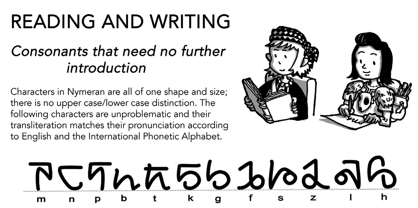 One of Glow's most distinctive features is the fully developed Nymeran language, crafted by conlangers Niamh Doyle and BenJamin Paul Johnson specifically for the series. Used throughout the comic for spells, magical technology, and immersive sound effects—much like katakana in manga—Nymeran adds a rich, sonic texture to the world. Whether etched into ancient artifacts, spoken in arcane rituals, or shouted during intense combat scenes, the language grounds the setting in a deep, lived-in authenticity.