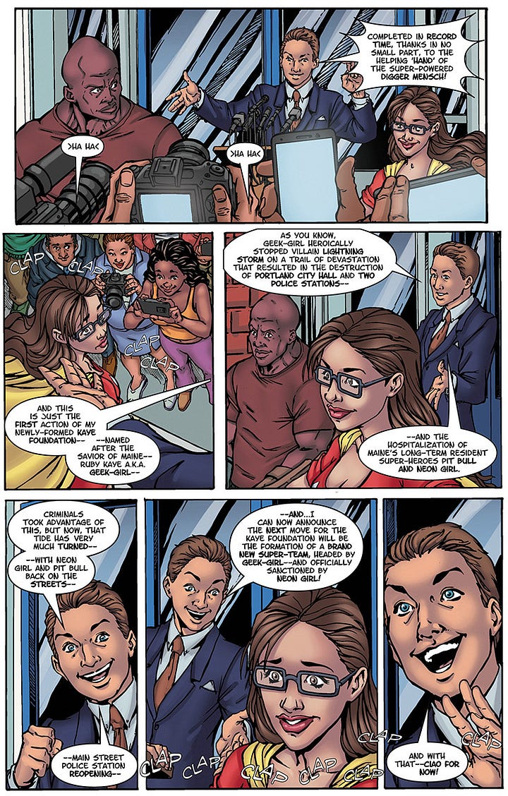 Since landing a pair of power-inducing super-tech glasses, ‘Geek-Girl’ (a moniker jokily given to Ruby Kaye by her BFF Summer James after Ruby’s initial difficulty handling her newfound super-strength led to some klutzy actions) has blossomed from a self-satisfying ‘It Girl’ to the heroine of her city of Maine – taking down major-threat super-villain Lightning Storm and playing an integral part in stemming the crime wave that sprung up in the wake of the damage Lightning Storm did to Maine’s law enforcement; leading to Geek-Girl being offered the role of fronting a new Super-Team.