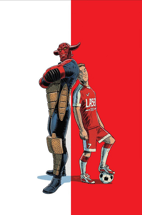 Originally published in two volumes by the trio of Wagner and Cornwell, alongside the late great Alan Grant, Rok of the Reds is a black comedy about revenge, redemption, and relegation. It follows Rok of Arkadi, an alien who seeks refuge on Earth after his homeworld is destroyed by bounty hunters. However, his attempts to hide under the radar are complicated when he has a chance meeting with arrogant young footballer Kyle Dixon, a bad boy who has been causing problems for his struggling team.