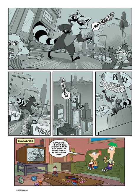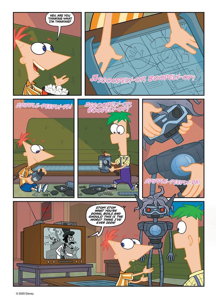 The second story features an alternate reality take on our fan-favorite characters, with Dr. Doofenshmirtz as a cheesy, late night TV horror movie host. When Phineas and Ferb discover actual monsters in Danville, they seek out Doof’s help, even as Candace, a staunch skeptical reporter, vows to reveal them as frauds. With the help of Doof and his horror movie knowledge, the kids build wild inventions to confront the creepy creatures, before facing their largest monster yet: a gigantic, feral Perry the Platypus!