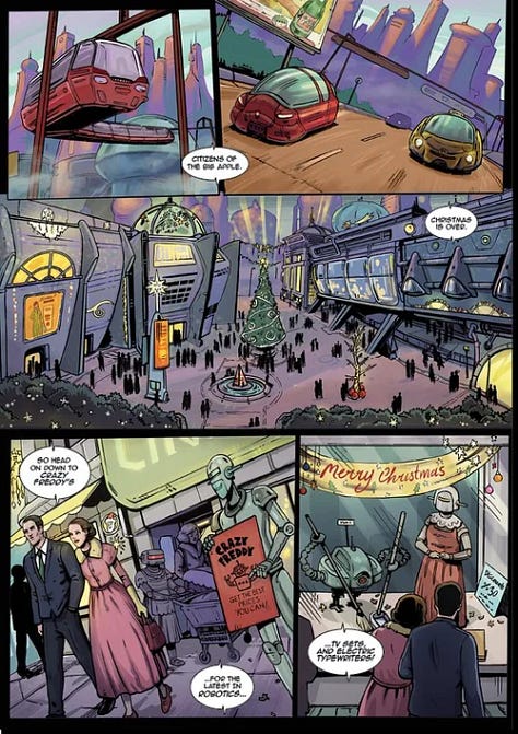 Artistically, the book is stunning. The attention to detail is first-rate—from sprawling cityscapes and sleek robots to the street-level fashion and character designs. Every panel feels alive with purpose and atmosphere.