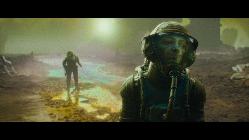 The first of the new images shows breakout talent Aneurin Barnard (The Goldfinch, Dunkirk) as the Rogue Trooper. Alongside this, we see Jemaine Clement (Avatar 2: The Way of Water) and Matt Berry (What We Do in the Shadows) as scheming battleground looters Mr Brass and Mr Bland. We also get a glimpse of a hulking war vehicle roaming the planet Nu Earth, where the brutal war between the Norts and Southers takes place. The third image depicts two Souther soldiers, lost, traversing the toxic wasteland and battlefield.