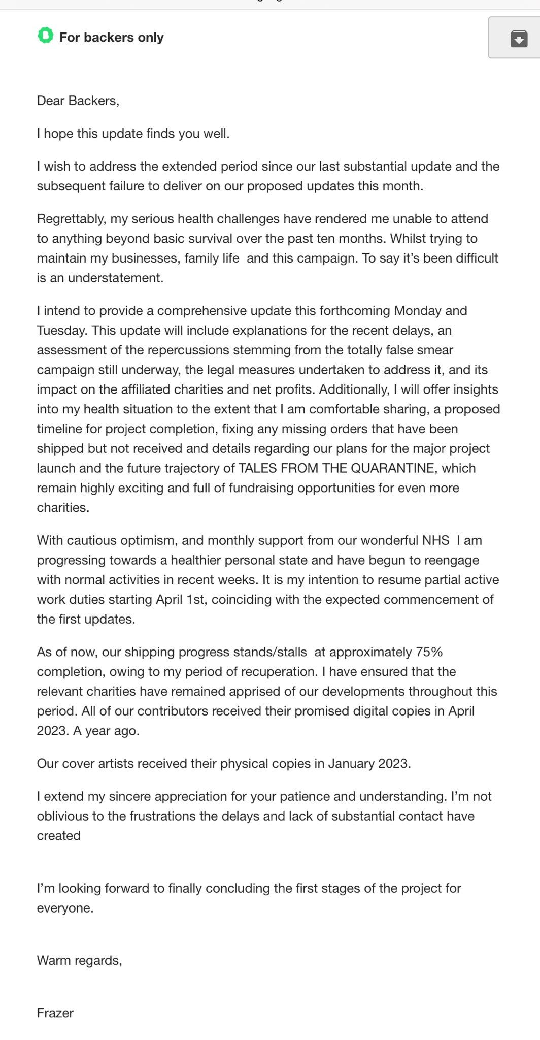 Way back in December 2022, Frazer Brown announced that just under 160 books had been sent out. Now, he follows up, citing a cyberattack on the UK Post Office that may cause delays or prevent some books from being received.