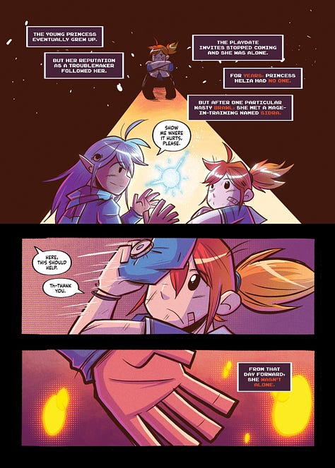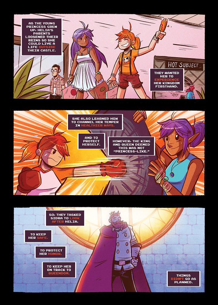 Luckily, Helia is joined by her (only) friend and bodyguard, the ice witch Sidra. Together, the pair will brave the deserts of Flaterra, the blizzards of Frosterra…uh, you get the idea…until they’ve rescued the wayward prince, thwarted Gogo, and punched every henchman they can find. And maybe, by the end of their journey, Helia and Sidra will realize their connection goes beyond mere friendship…