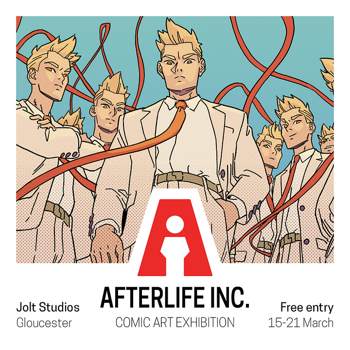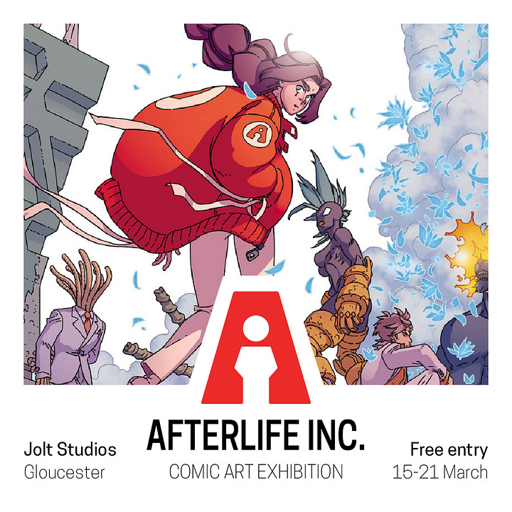 The exhibition is free to attend and runs from Saturday 15 to Friday 21 March at Jolt Studios, Gloucester. This is a fantastic opportunity to meet likeminded creators and fans, discover amazing artwork, and even grab a signed copy of Afterlife Inc.