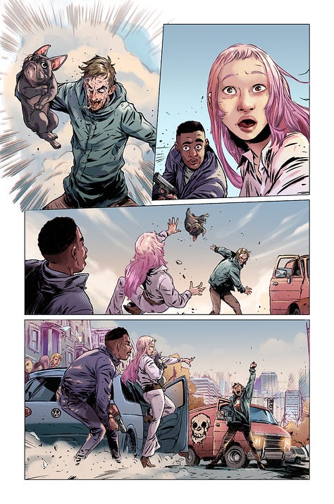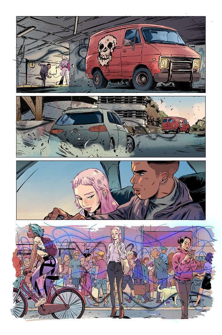 “For The Theory of K.O., I wanted to create an entertaining series inspired by my teenage reading—full of action and fun, but also exploring important themes like ecology, technology, and human society,” said Mathieu Reynès. “I proposed this series to Mad Cave Studios because I had already collaborated with Mark Irwin on a previous project and trusted him. Lucky for me, Mad Cave was about to launch Nakama Press. It’s motivating to be at the beginning of something like this and benefit from this exciting new energy.”